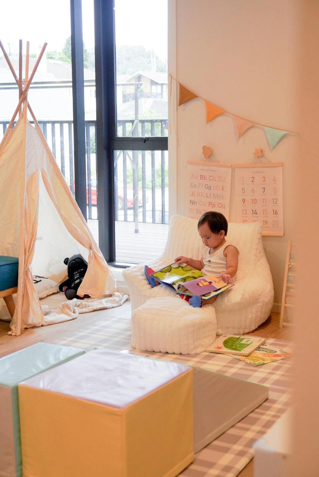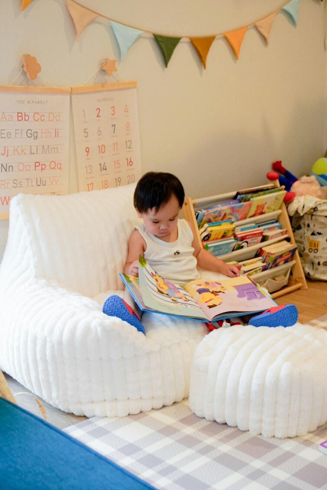 Sage’s little reading nook 🤍 This Narabean beanbag is so soft, supportive, and the perfect size for him. He loves sitting here with his books. It’s cosy, comfy, and well-loved. 🤍